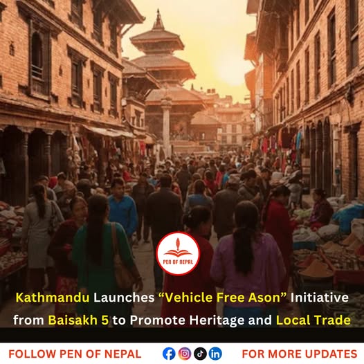 Kathmandu Metropolitan City has announced “Vehicle Free Ason” starting from Baisakh 5, 2083, aiming to promote a vibrant and cultural Ason area. The initiative will restrict vehicle entry every Saturday in key routes from Kamalakshee, Bhotahiti, and Mahabouddha to Ason. The area will develop as a heritage zone supporting local trade, culture, and social activities under city police management.