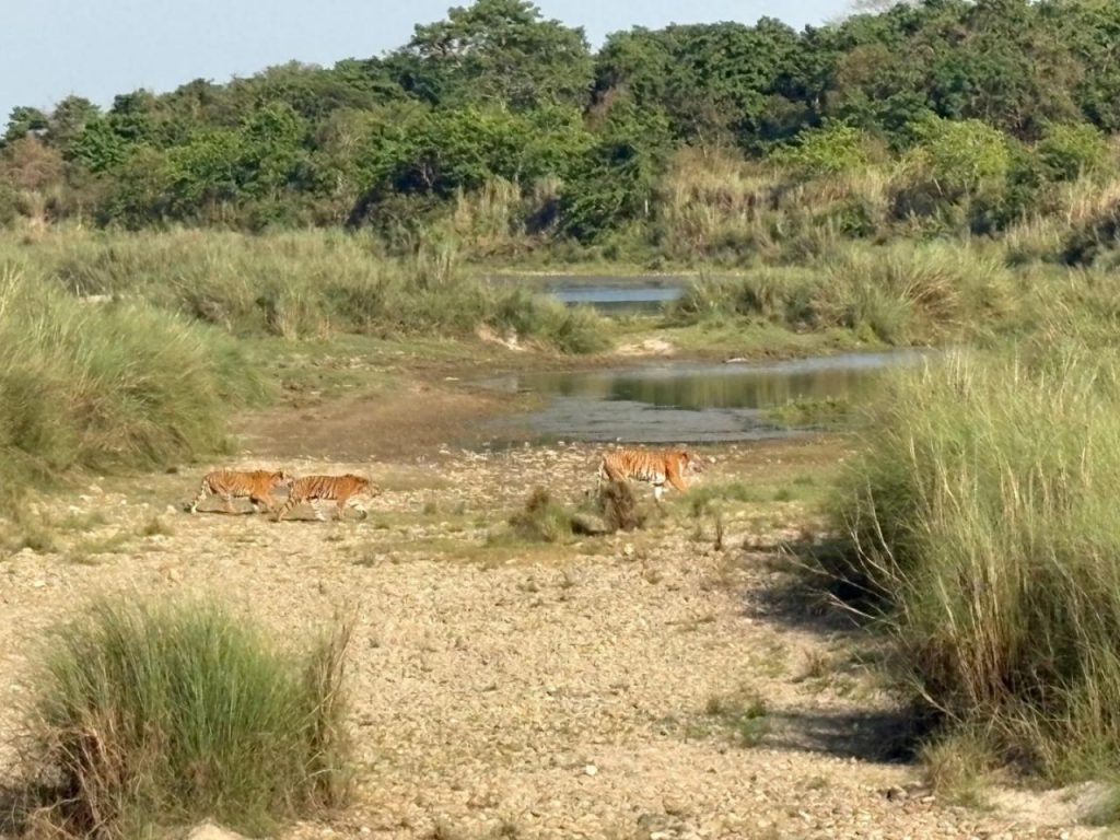 What an incredible sight—three tigers together in the wild at Chitwan National Park!