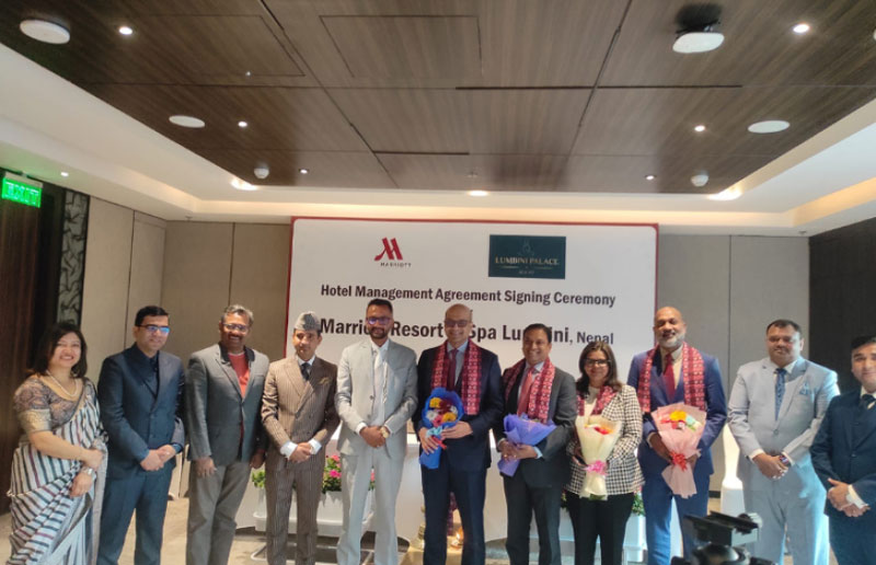 The agreement was concluded with Global Hospitality Licensing S.A.R.L. (Marriott International) in the presence of senior representatives from both organizations. Lumbini Palace Resort Limited was represented by Chairman Mr. Deepak Pandey and Managing Director Mr. Roshan Kumar Neupane, while Marriott International’s leadership included Mr. Neeraj Govil (Chief Operations Officer, Asia Pacific), Mr. Kiran Andicott (Senior Vice President, Development – South Asia), and Ms. Juhi Roy (Vice President, Development – South Asia).